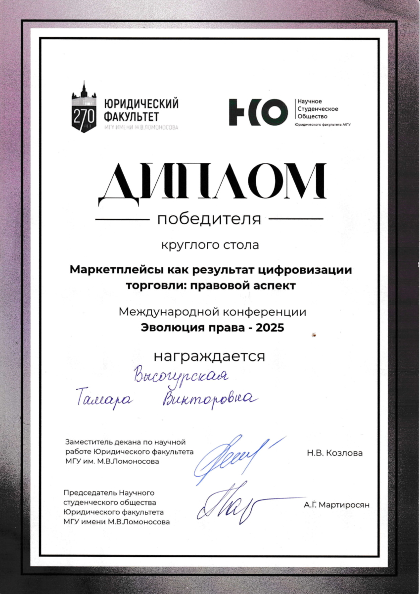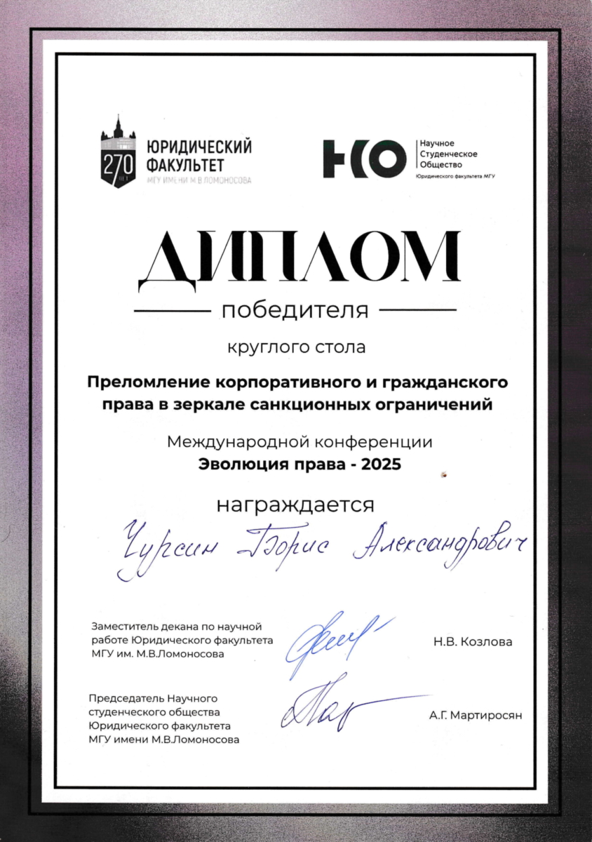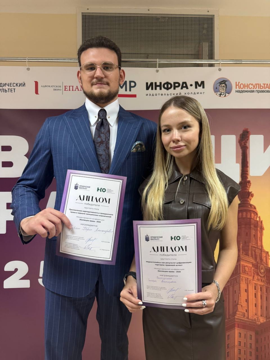 Аспиранты юридического факультета Высогурская Тамара и Чурсин Борис победители международной научно-практической конференции «Эволюция права – 2025», которая прошла 10-11 октября 2025 года на базе юридического факультета МГУ имени М. В. Ломоносова.
