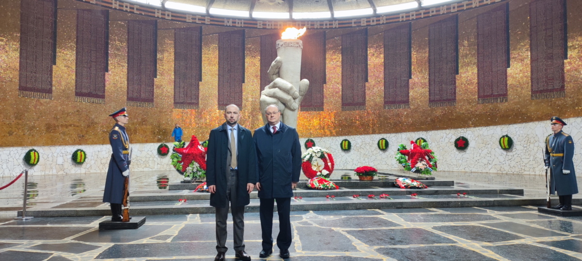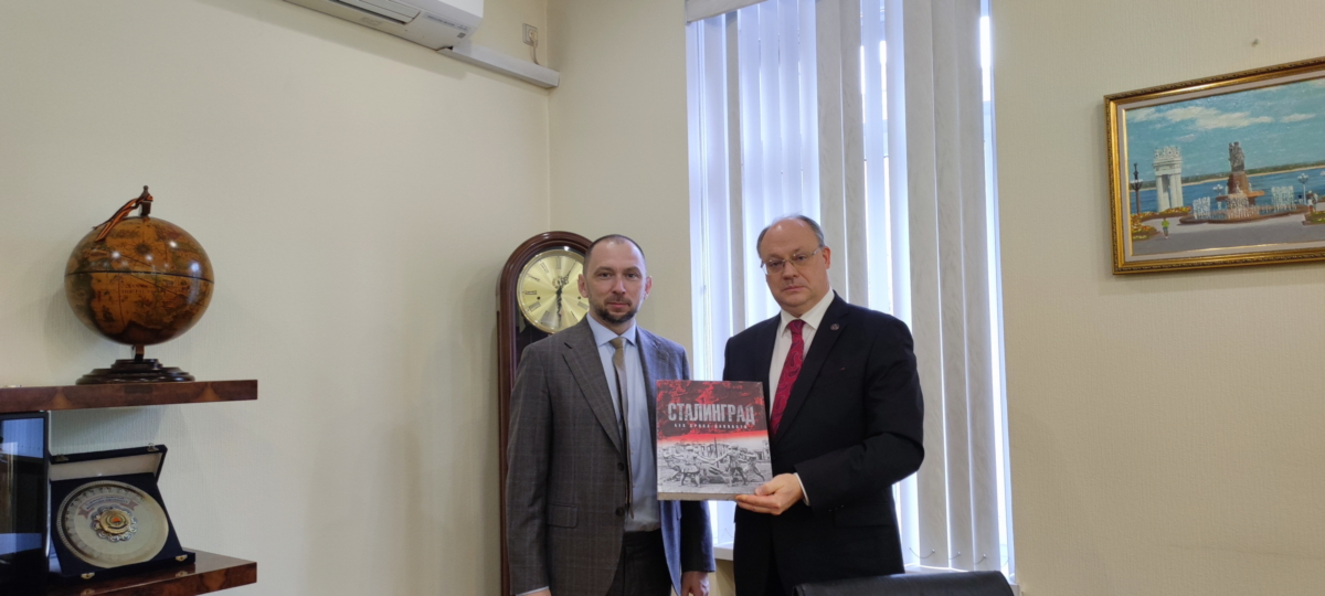 В честь 80-летия Великой Победы Алексей Дронов вместе с и.о.директора Института Александром Алмосовым посетили Мамаев Курган и почтили память защитников Сталинграда. Институт преподнес гостю книгу «Сталинград. Без срока давности» с уникальными историческими материалами, выпущенную специально к юбилею победы.