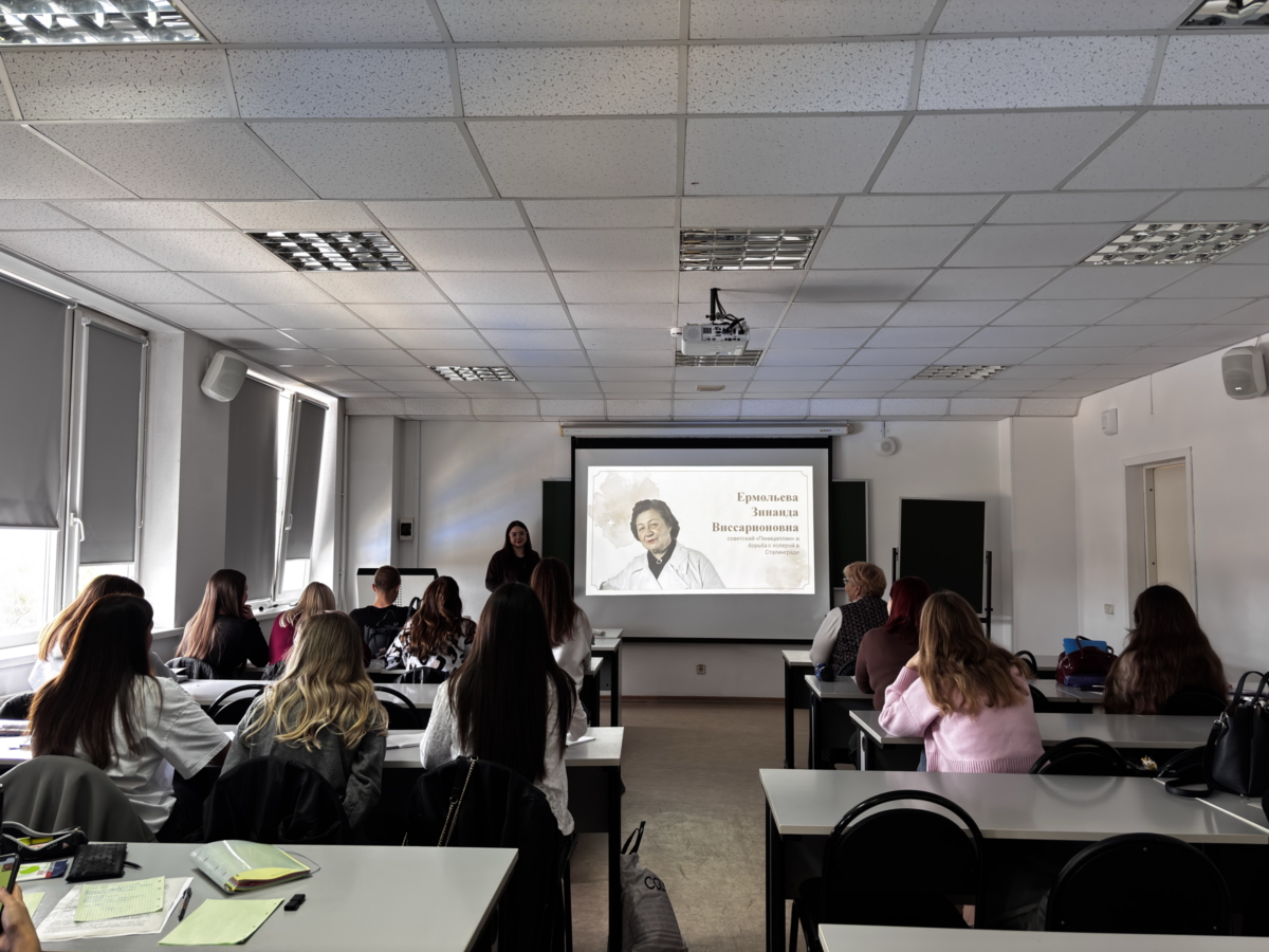 О нашей землячке Зинаиде Виссарионовне Ермольевой рассказали студентки Леонова Елизавета (ПСД-200) и Мосеева Елизавета (БкПс-300). Госпожой Пеницилин – назвал Ермольеву нобелевский лауреат Хоуард Уолтер Флори, создавший совместно с А. Флемингом и Э. Чейном пенициллин и его целебные свойства, за то, что она в 1942 году создала российский аналог британского лекарства, получившего название «пенициллин-крустозин Е». И тогда же этот антибиотик начали активно применять в Красной Армии, что помогло спасти огромное количество жизней и сократить число осложнений после ранений и операций. Сам И.В. Сталин советовался с Зинаидой Виссарионовной о начале наступления в Сталинграде, т.к. в это время в немецких войсках начались эпидемии холеры и дизентерии, которые могли перекинуться в стан советских войск. Благодаря её действиям на месте были созданы необходимые вакцины, прививалось по 50 тысяч человек в день. Эпидемии в Сталинграде удалось быстро локализовать и ликвидировать, предотвратив массовые заболевания среди защитников и жителей города, что, несомненно, оказало влияние на исход битвы.