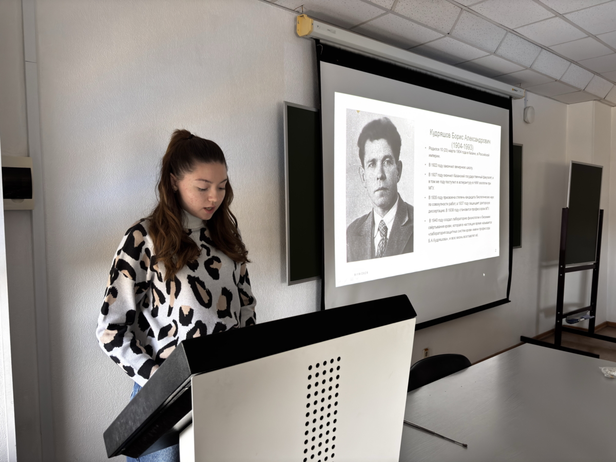 Финогентова Ева (ПСД-200) рассказала собравшимся о Борисе Александровиче Кудряшове, разработчике препарата «Тромбин», который использовался для остановки кровотечений и улучшения свертываемости крови. Его изобретение сыграло важную роль в лечении тяжелых ранений, обеспечивая быстрое восстановление пациентов после операций и травм. Благодаря работам Кудряшова медицина смогла эффективно бороться с осложнениями травматического шока и потери крови, повысив эффективность лечения раненых.