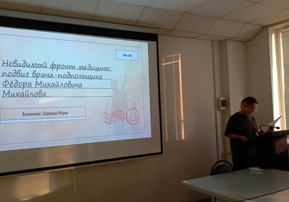 С врачом-подпольщиком, спасающим больных и раненых советских людей из лагеря смерти – «Гросс-лазарет №301» в городе Славуте Хмельницкой области - Михайловым Федором Михайловичем – познакомила присутствующих студентка БкПс-300 Зарезина Мария.
