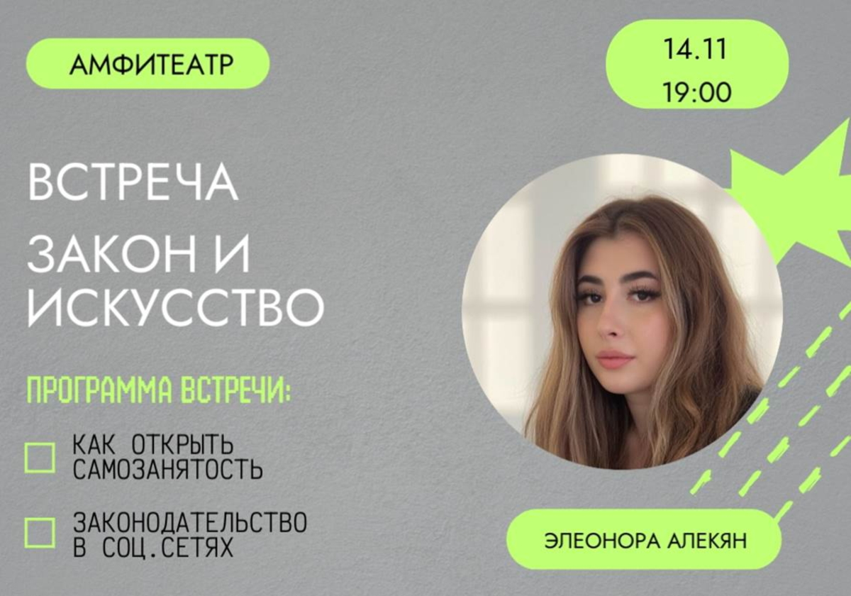 Мероприятие представляет собой встречу-лекцию с юристом, где будет рассказано, как креативным людям работать в социальных сетях с учетом законодательства, открывать самозанятость, как платить налоги, суть авторского права.