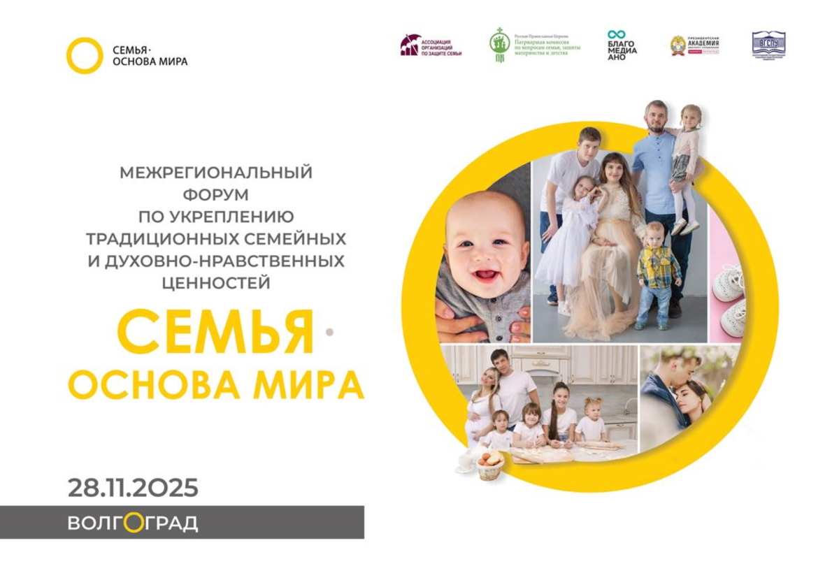 28 ноября 2025 года в Волгоградской области состоится межрегиональный форум по укреплению традиционных семейных и духовно-нравственных ценностей «Семья – основа мира», на котором соберутся федеральные и региональные эксперты в области семейно-демографической политики. Отдельные симпозиумы и сессии пройдут по направлениям: образование и просвещение, медицина, социальная сфера. Большой блок будет посвящен работе со студентами.