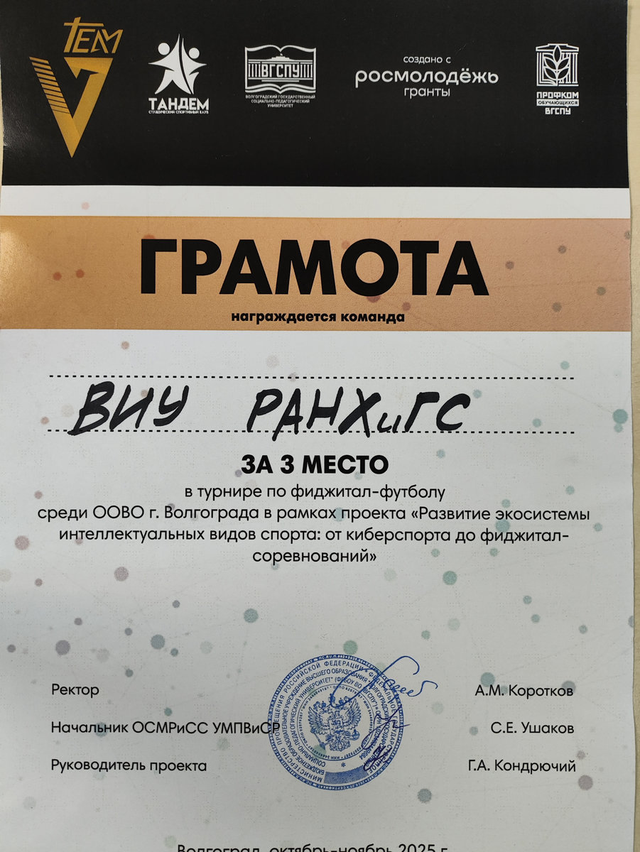Студенты Президентской академии в Волгограде бронзовые призёры соревнований по фиджитал - футболу