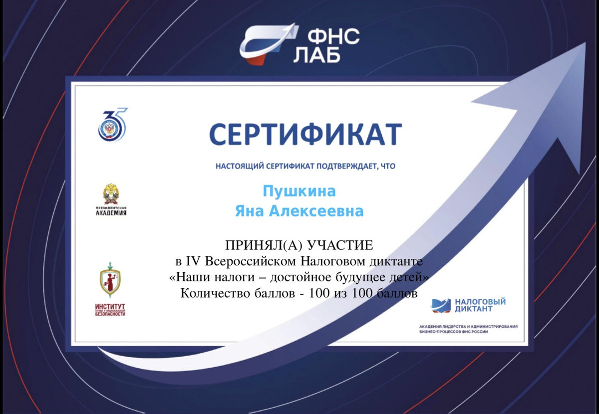 По результатам прохождения налогового диктанта студенты набрали от 70 до 100 баллов. Максимальный результат получили Касмина Лилия, Костяков Артем, Бондаренко Дмитрий, Пушкина Яна, Альчанова Карина, Вилкова Полина.
