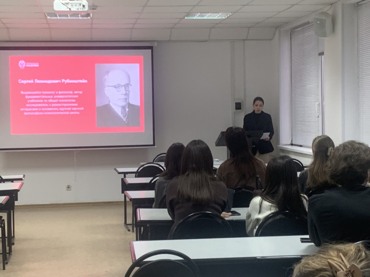 Старший преподаватель кафедры социологии, общей и юридической психологии А.Ю. Хачатрян со студентами направления подготовки «Психология» обсудила, каков был вклад в Великую Победу психологов. А вклад был очень серьезным: от научных разработок по маскировке важных объектов, до работы по восстановлению бойцов в эвакогоспиталях и изучения психологии человека в период войны.
