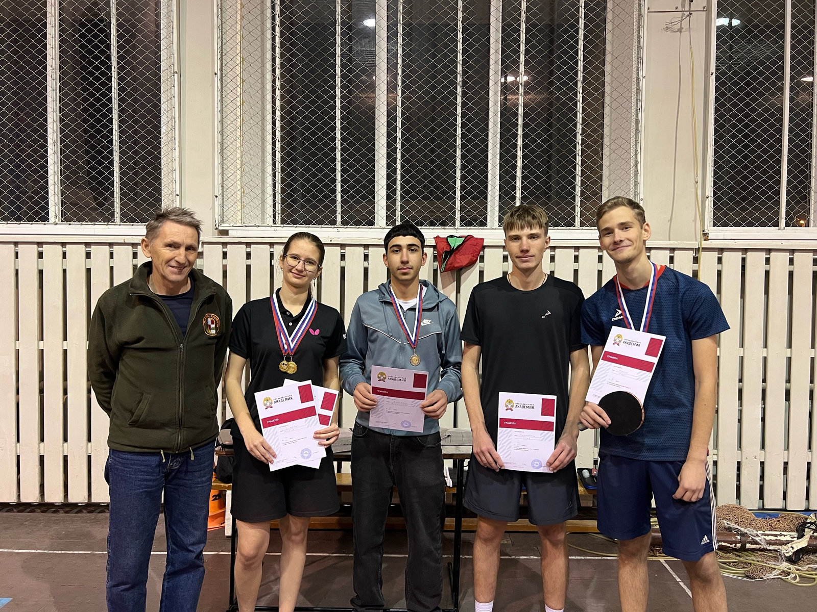 В волейбольных баталиях, которые организовал заведующий кафедрой ФиСП Дзержинский Г.А., отличились студенты юридического факультета, которые и стали новогодними чемпионами: Русаков В., Слащев С. ПНБ-302, Камышов А., Резникова К. БкЮ-301, Перфильев М. БкЮ-402, Медведев А. БкЮ-203, Ахметов О. ст.преподаватель кафедры ФиСП. На вторую позицию поднялась команда экономического факультета, третье место завоевала команда факультета ГМУ.