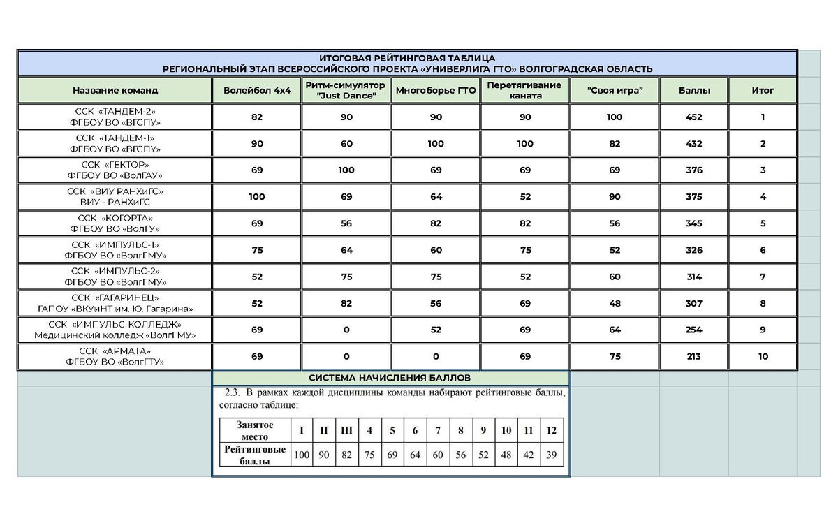 Участниками Универлиги ГТО стали 10 сильнейших команд студенческих спортивных клубов образовательных организаций высшего и профессионального образования Волгоградской области. Соревнования были организованы на базе Волгоградского социально-педагогического университета.