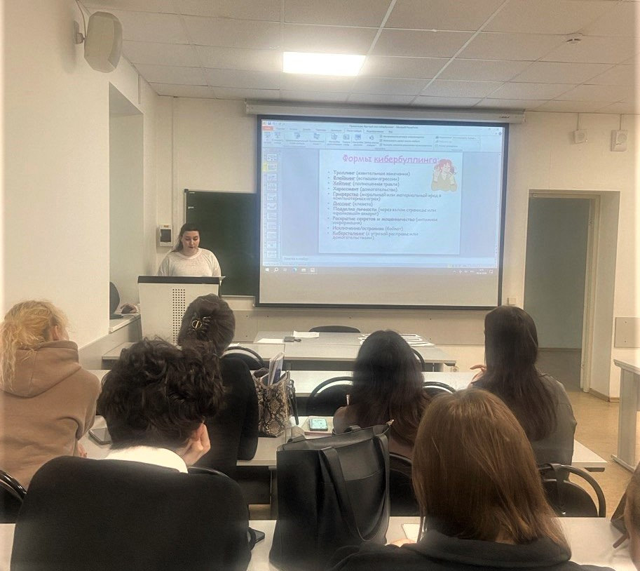 Преподаватели кафедры лингвистики и межкультурной коммуникации Маслова А.Д., Компанеева Л.Г., Камышанова Л.В., а также и. о. заведующего кафедрой Барышникова Г.В. организовали мероприятие для студентов 2 курса юридического факультета с целью профилактики кибербуллинга, т.е. травли в цифровом пространстве.