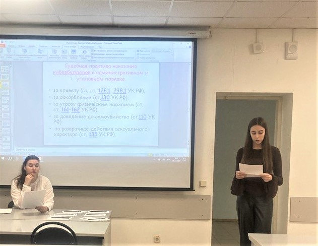 Студентки юридического факультета Наталия Сихварт, Алина Галиулина, Анфиса Гордиенко, Виктория Гарушева, Карина Вершкова и Виктория Потапова представили свои доклады. Они рассказали о законах, регулирующих общение в социальных сетях и оберегающих граждан нашей страны от оскорблений, клеветы и других проявлений кибербуллинга. Было отмечено, что в российском законодательстве предусмотрена высокая степень ответственности вплоть до уголовного наказания за деструктивное опасное поведение, угрозы и клевету в адрес других людей в интернет - среде.